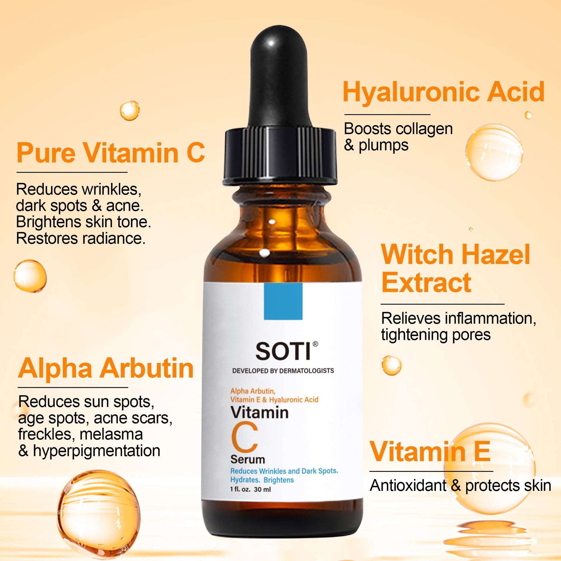 Vitamin C Face Serum with Hyaluronic Acid, Alpha Arbutin and Vitamin E, Anti Aging for Dark Spots, Wrinkles & Acne, Brightens Skin Tone, Restores