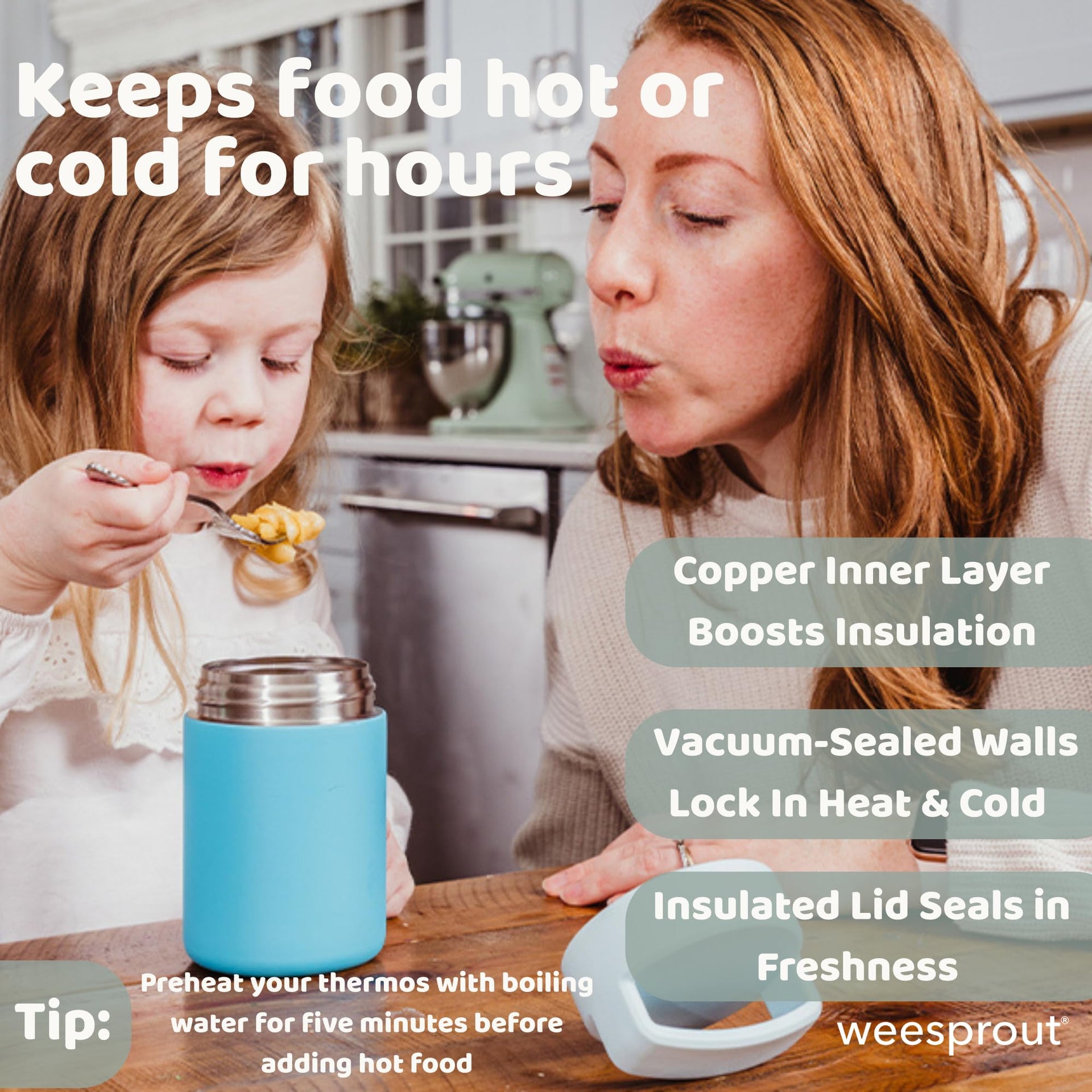 • ✅ A DIFFERENT LID DESIGN FOR DIFFERENT RESULTS - Are you tired of insulated thermoses that don’t work? If you want different results, you need a thermos that’s designed differently! Most insulated thermoses lose heat and cold where the lid meets the body of the thermos because the seal isn’t insulated. That's why the WeeSprout seal is insulated inside the body of the food jar. Hot and cold air can't escape!
