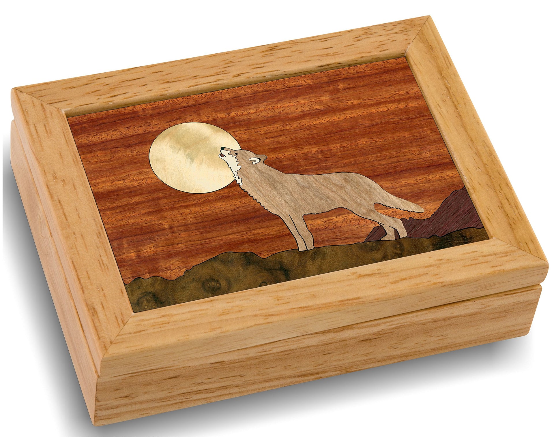 Color: HOWLING AT THE MOON BOX (#4117 size: 4"x5"x1.5"). . . .An original work of art - No two are the same - Each is unique . . . . A label comes inside each Jewelry Box that explains the wood species that were used in its creation . . . . This Design shows 10 individual pieces and 8 unique wood species . . . . Each wood shown has its own unique wood grain pattern and color.