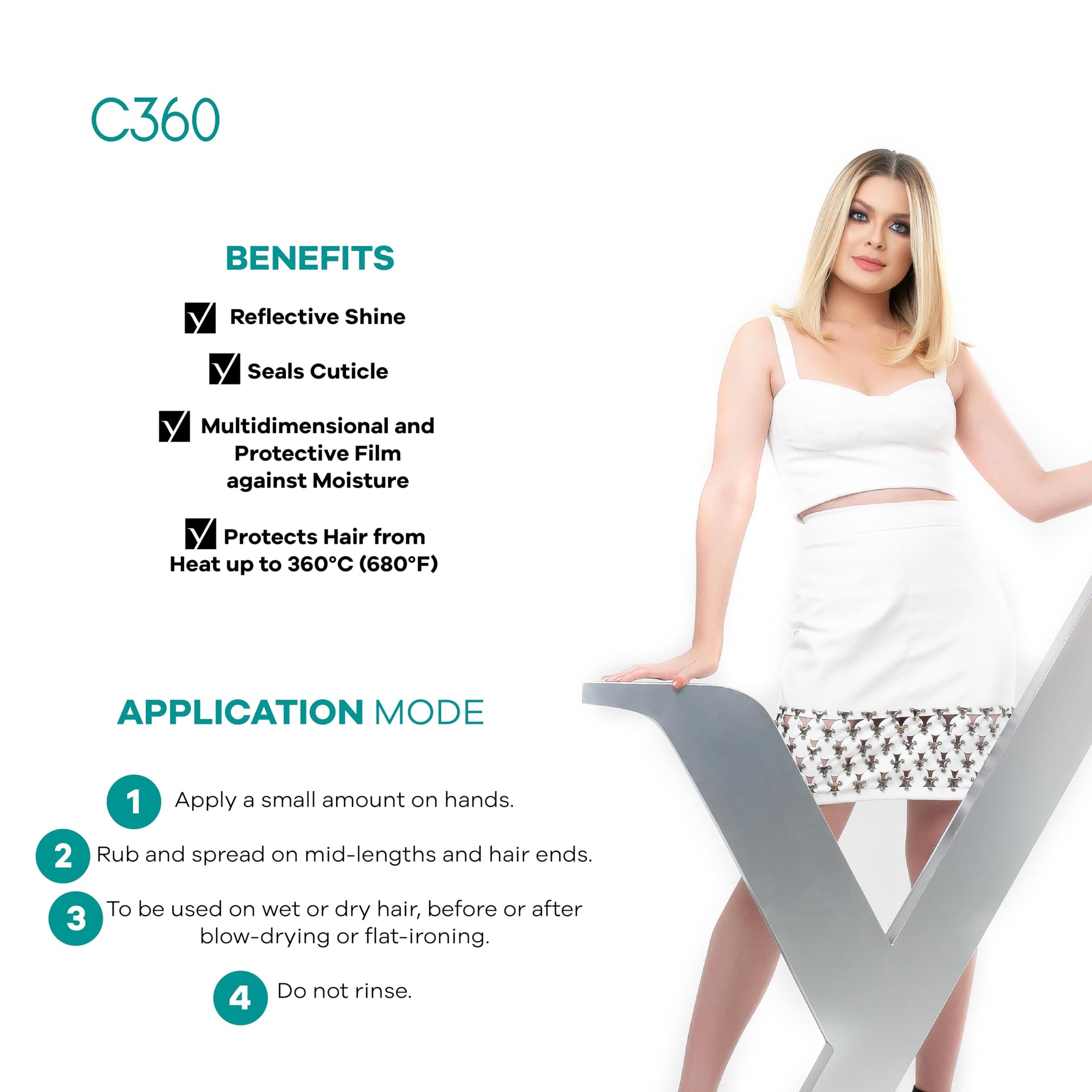 • C360 professional Gloss provides intensive restore and pro repair therapy, protecting the hair against heat from hair dryers and flatirons and humidity effects