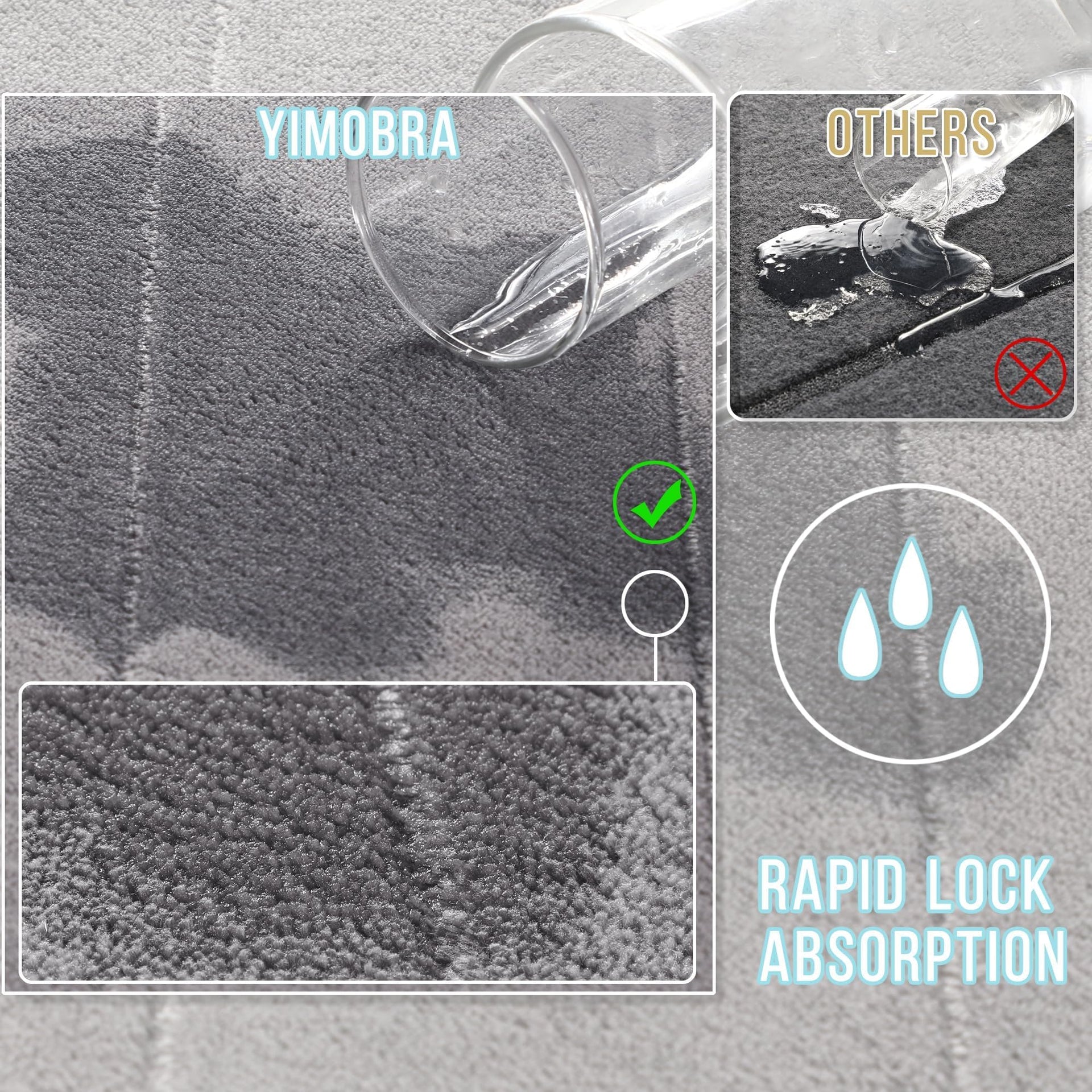 - 【Rapid Lock Absorption: Coral Velvet + Deep Foam Core】Yimobra bath mat engineered with premium coral velvet surface and deep memory foam core, our Rapid Lock technology instantly traps water. The coral velvet fibers actively pull in liquid while the high-density foam core prevents seep-through, ensuring maximum dryness after every use