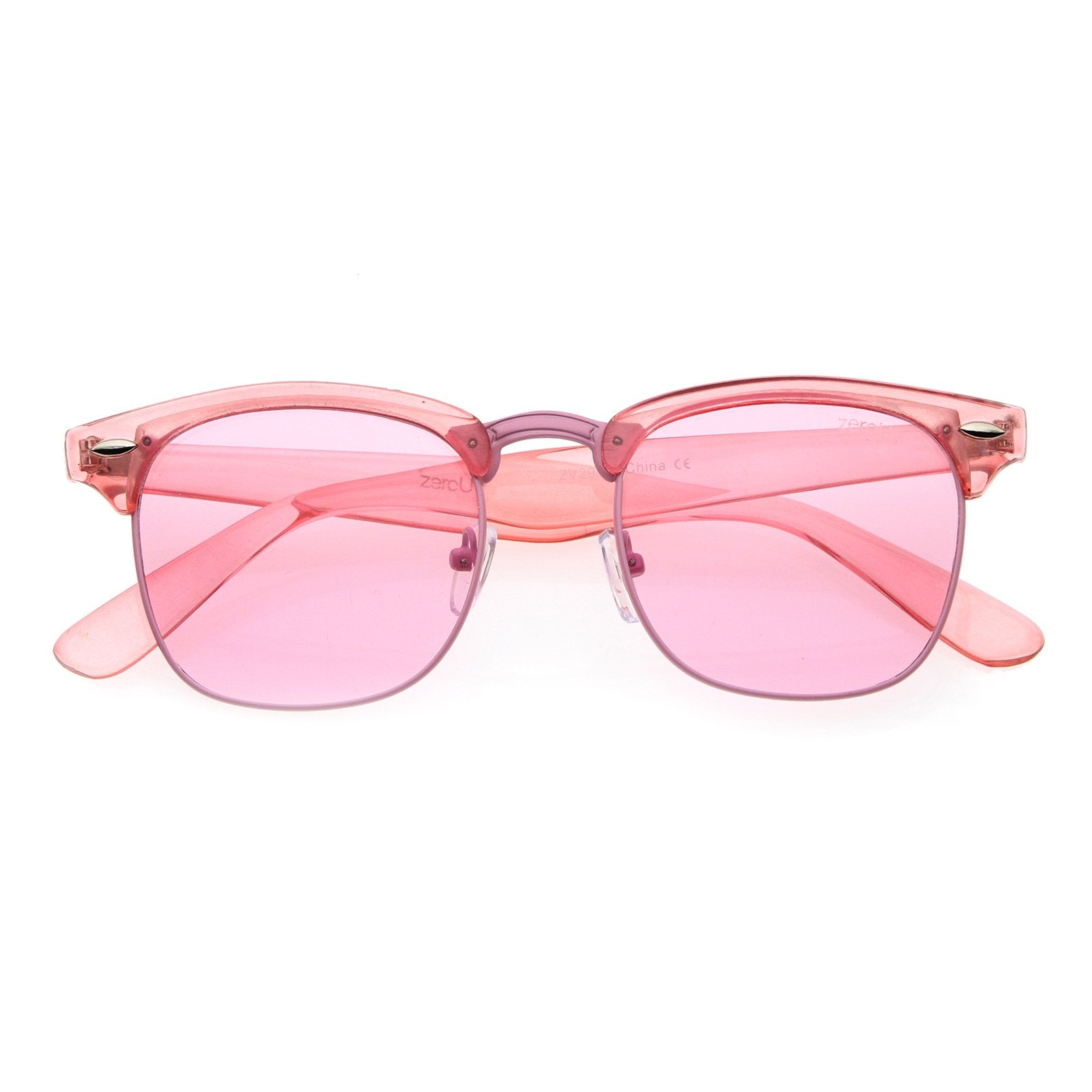 A modern take on an iconic design, these translucent sunglasses feature a half frame shape with horn rimmed details. Accented with metal trim and nose bridge, these fun sunglasses are complete with square color tinted lenses. Designed in a variety of fun colors, these half frame sunglasses are perfect for a day a sunny day. Made with a plastic and metal based frame, English style nose pieces, metal hinges, and polycarbonate UV400 protected lenses. Lens Height: 40 mm | Lens Width: 49 mm | Bridge: 18 mm | Frame Total: 135 mm