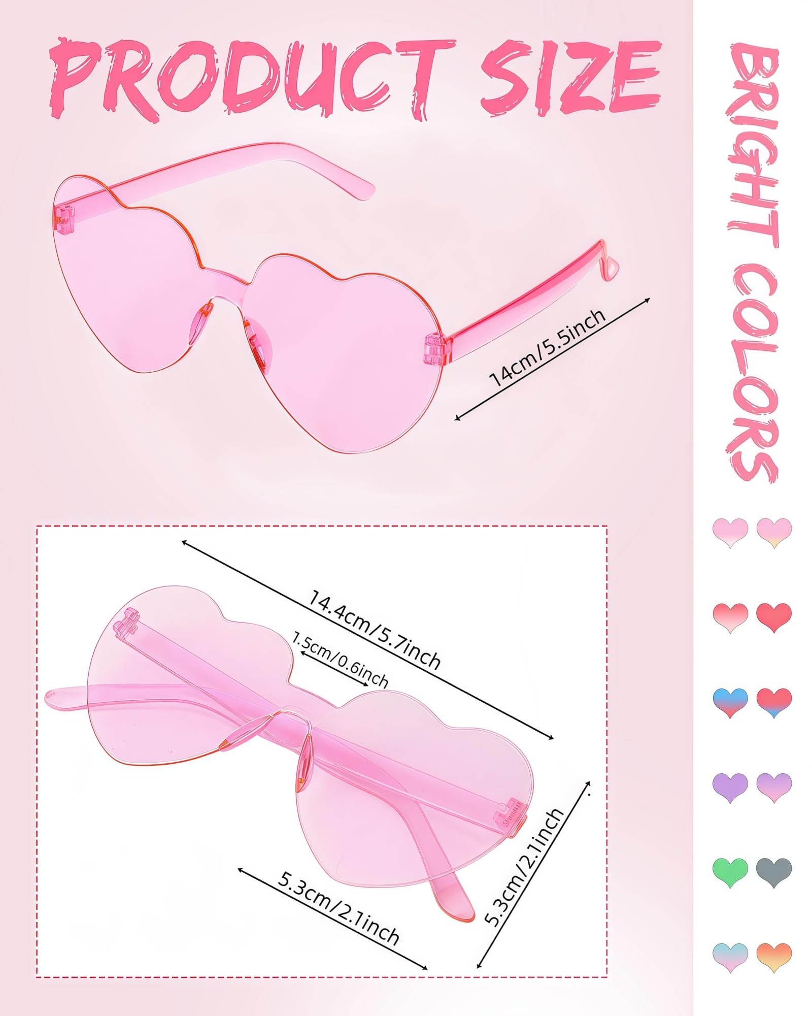• Quality material: The frame is made of good quality PC material, while the lens adopts HD material, durable and sturdy to use, not just colorful, but also featured with love shape, great for girls and women party use.