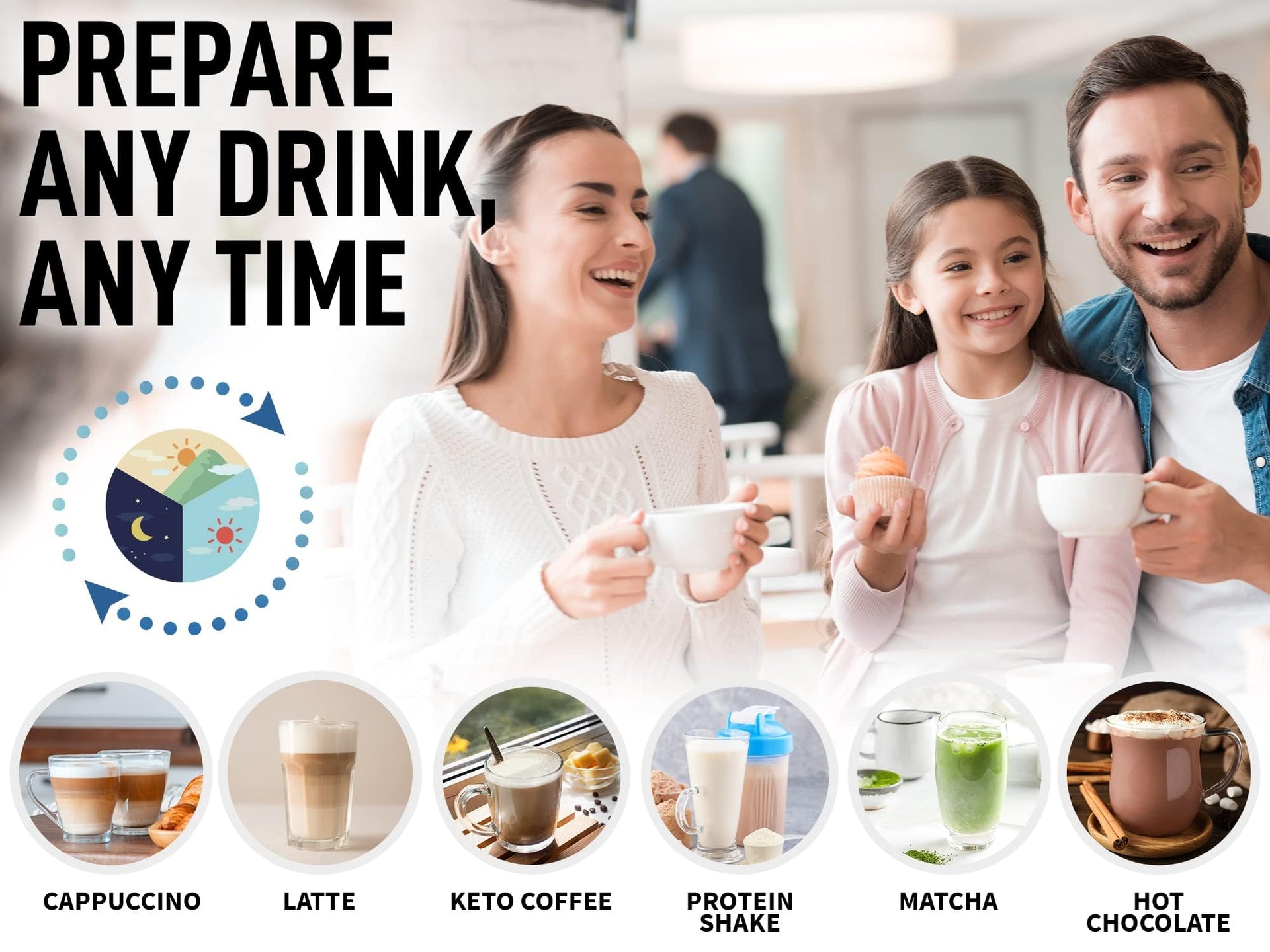 - CREAMY VELVETY FROTH IN SECONDS: Making coffee-shop-style recipes at home is as simple as it can be with this milk frother. The 13,000 RPM motor and 25 spiral rings on the whisk let you whip up rich foam in no time. Level up your everyday warm or cold coffee, latte, cappuccino, hot chocolate, matcha, or powdered drinks with this coffee foam.