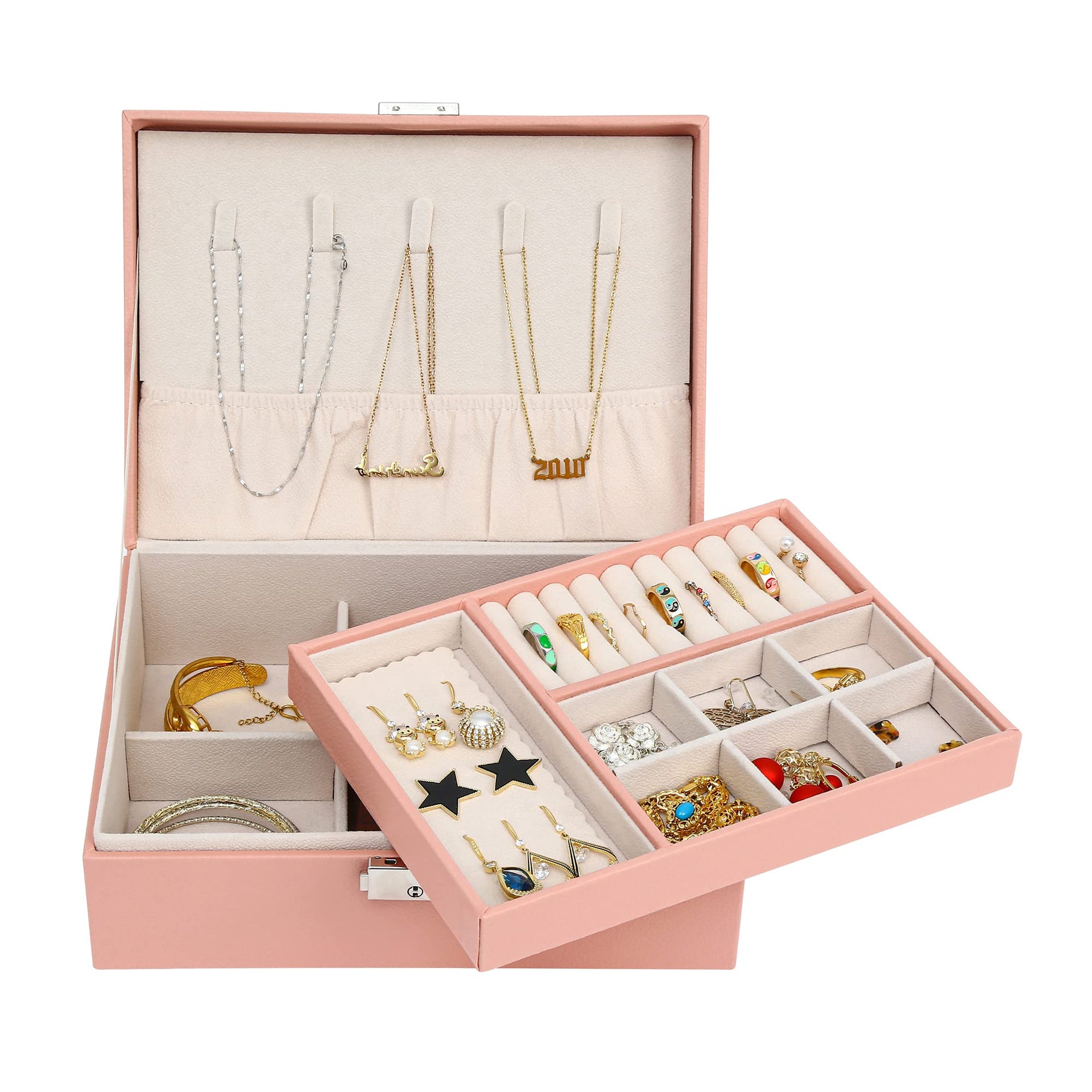 • 【Extra-large Capacity】 2-Layer jewelry box provides enough space for your jewelry, the bottom part has 6 slots and 3 removable compartments for rings, earrings, and other jewelry. Top cover has 5 hooks for hanging necklaces and pendants. 9 ring rolls, 6 small slots(removable), earring plate